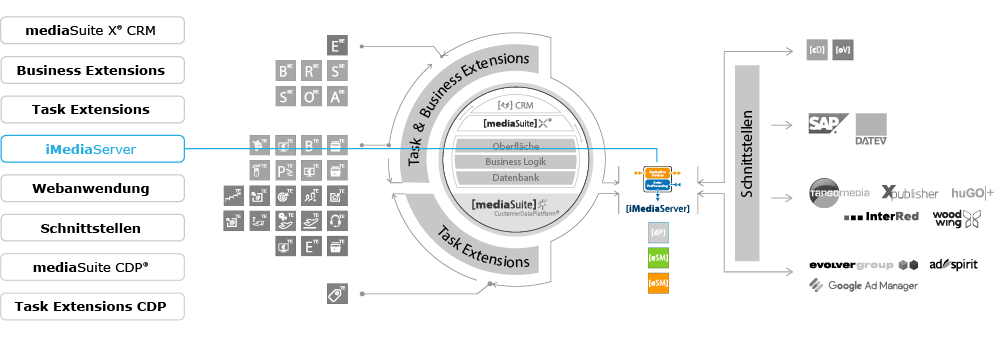 mediaSuite Business Extensions Task Extensions CRM iMediaServer Webanwendungen Schnittstellen CustomerDataPlatform Task Extensions CDP Business Extensions Task Extensions CRM Task Extensions CDP Webanwendungen Schnittstellen iMediaServer mediaSuite CustomerDataPlatform